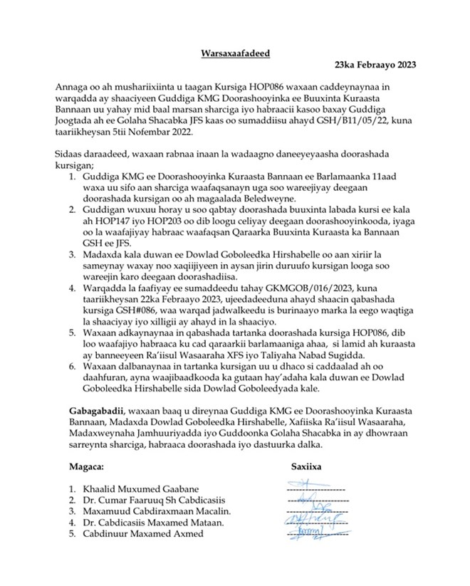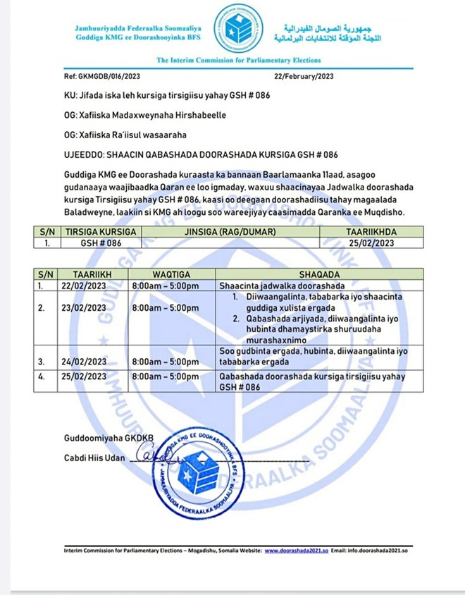 Khamiis, February, 23, 2023 (HOL) - Gudiga ku meel gaarka ee doorashooyinka kuraasta ka banaan Golaha Shacabka Baarlamaanka Fedaraalka Soomaaliya ayaa shaaciyay jadwalka qabashada doorashada kursiga sumadiisu tahay HOP 086.