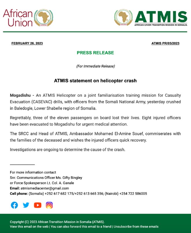 Howlgalka ATMIS oo soo saaray warsaxaafadeed kooban ayaa sheegay inuu socdo baaritaano lagu ogaanayo waxa sababay shilkan.