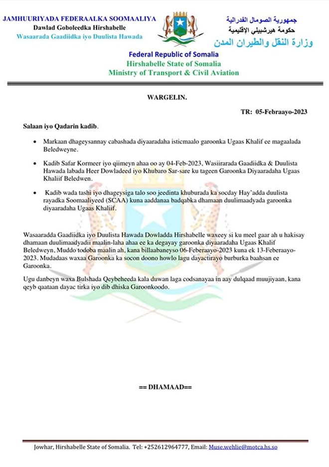 Isniin, February, 6, 2023 (HOL) - Wasiirka Wasaarada Gaadiidka iyo Duulista Hawada maamulka Hirshabeelle Muuse Salaad Wehliye ayaa soo saaray amar lagu hakinaayo duulimaadyada diyaaradaha sida maalin laha ah uga dagi jiray garoonka diyaaradaha Ugaas Khaliif ee magaalada Baledweyne.