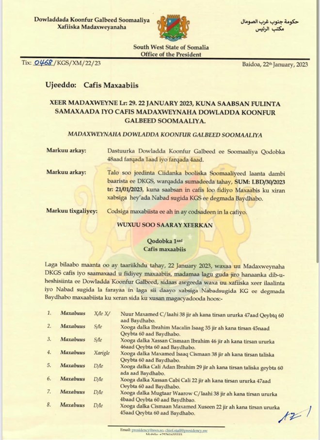 newsinsideSida lagu sheegay warsaxaafadeed kasoo baxay madaxtooyada Koonfur Galbeed, tallaabdan ayaa lagu sheegay inay qeyb ka tahay hannaanka dib u heshiisiinta ka socota Koonfur Galbeed.