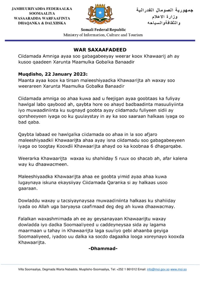 Axad, January, 22, 2023 (HOL) - Ciidanka booliiska gaarka ah ee Haramcad ayaa goor dhowayd ku guulaystay inay soo afjaraan kooxdii Alshabaab ee weerarka ku qaadday xarunta gbolka Banaadir.