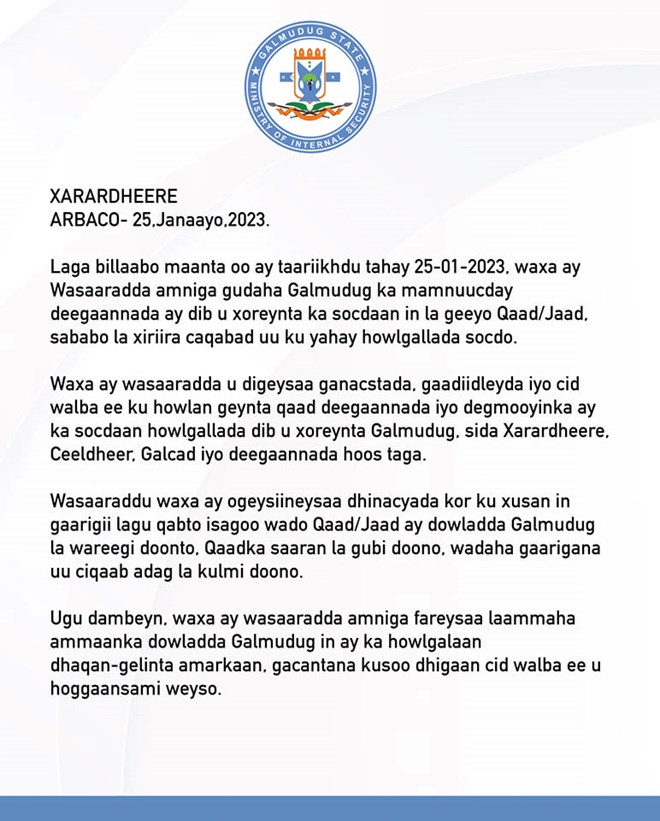 Arbaco, January, 25, 2023 (HOL) - Wasaaradda Amniga gudaha ee dowlad goboleedka Galmudug ayaa ka mamnuucday deegaannada ay dib u xoreynta ka socdaan ee Galmudug in la geeyo Qaad/Jaad.
