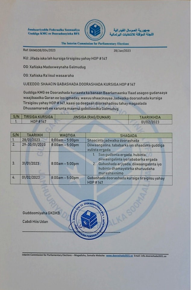 Sabti, January, 28, 2023 (HOL) - Guddiga ku meel gaarka ah ee doorashooyinka kuraasta ka banaan Baarlamaanka 11-aad ee dowladda Fedaraalka Soomaaliya ayaa Maanta shaaciyay Jadwalka qashada kursiga tirsigiisu yahay HOP#147 oo deegaan doorashadiisu tahay magaalada Dhuusamareeb, kaasoo ka mid ah kuraasta ka banaaneyd Golaha Shacabka.