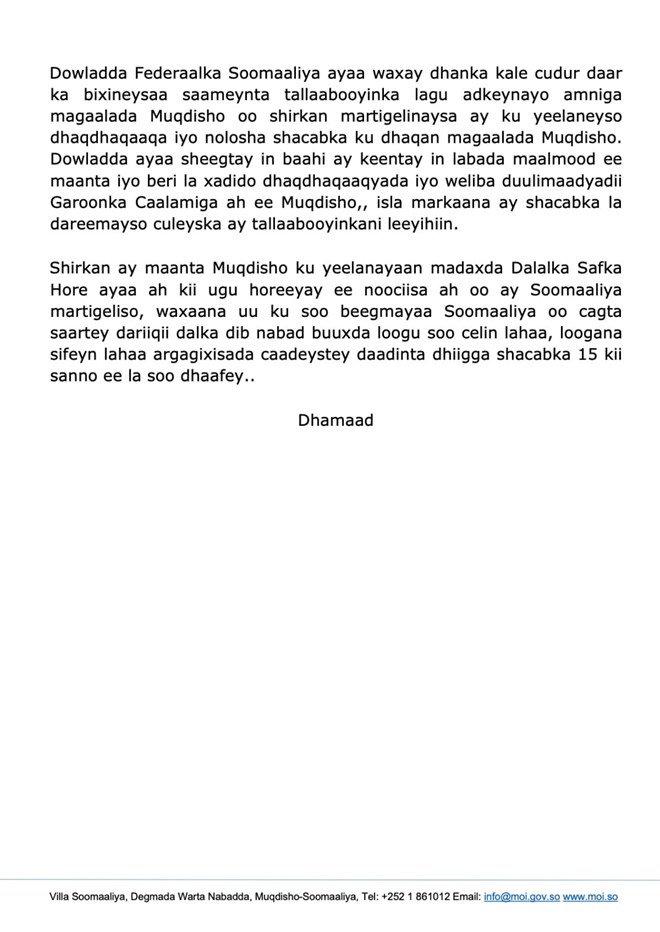 Talaado, January, 31, 2023 (HOL) - Dowladda Fedaraalka Soomaaliya ayaa war rasmi ah kasoo saartay shirweyne Ka dhacayo gudaha magaalada Muqdisho oo ay ka qeybgalayaan madaxda dalalka ciidamadooda ka joogaan Soomaaliya, waxaana shirkaan oo ay martigalineyso dowladda Soomaaliya ayaa lagu casuumay Wasiiradda Gaashaandhiga iyo Taliyeyaasha ciidamada dalalka dariska ah ee loo yaqaano dalalka safka hore.