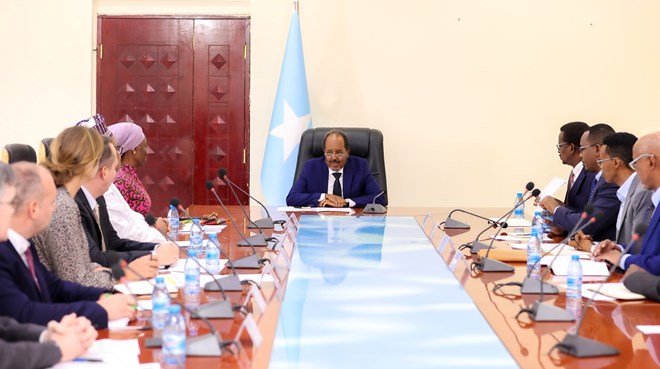 Arbaco, January, 4, 2023 (HOL) - Madaxweynaha dowladda Federaalka Soomaaliya Xasan Sheekh Maxamuud oo Maanta Madaxtooyada Qaranka kula kulmay Danjireyaasha dalalka Maraykanka, Ingiriiska, Talyaaniga, Itoobiya, Wakiillada Gaarka ah ee Qaramada Midoobey, Midowga Yurub iyo Midowga Afrika ayaa uga warbixiyey mirodhalka howlgalka dalka lagaga xoreynayo Ururka Al-shabaab.
