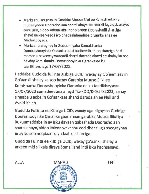 "Guddida fulinta ee xisbiga UCID waxa ay go'aamisay in go'aankii kasoo baxay garabka Muuse Biixi ee Koomiishanka Doorashooyinka Qaranka ee ku taariikhaysnaa 17/7/2023 anay si naba u aqbalin go'aanka sharcidarada ah ee waxba kama jiraan ka ah" ayaa lagu yidhi warsaxaafadeeda.