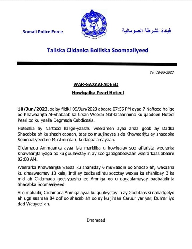Sabti, Juun, 10, 2023 (HOL) - Ciidamada Booliiska Soomaaliya ayaa sheegay in 9 qof ay ku geeriyoodeen weerar koox hubaysan oo katirsanaa Alshabaab ay ku qaadeen hotel Pearl Beach ee xeebta Liido.