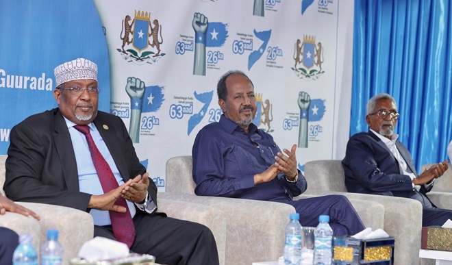 Isniin, Juun, 26, 2023 (HOL) - Madaxweynaha dowladda Fedaraalka Soomaaliya Xasan Sheekh Maxamuud oo khudbad ka jeediyey Munaasabadda xuska sannad guurada 63-aad ee markii calan Soomaaliyeed oo xor ah laga taagay dhul Soomaaliyeed, gaar ahaan gobollada Waqooyi ee dalka ayaa xusay qiimaha taariikhiga ah oo ay ka tarjumeyso maalintan oo ku suntan midnimo iyo Soomaalinimo.