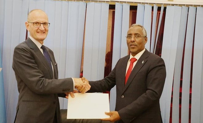 "Waxaan maanta nuqul ka mid ah warqadaha aqoonsiga danjirenimo ka guddoomay safiirka cusub ee dowladda Ingiriiska u fadhin doona dalkeenna Mudane Michael Nithavrianakis. Dalkeenna iyo Boqortooyada UK waxaa ka dhaxeeya xiriir qoto dheer oo iskaashi ku dhisan, waxaana ka wada shaqaynaa dhinacyada ammaanka, mashaariicda horumarinta, dhaqaalaha iyo gargaarka. UK ayaa ahayd dowladdii ugu horaysay ee wadamada Galbeedka ka tirsan ee Safaarad fadhigoodu yahay Muqdisho ka furatay dalkeenna 2013" ayuu yiri wasiirka arrimaha Dibadda Soomaaliya Abshir Cumar Jaamac Haruuse.