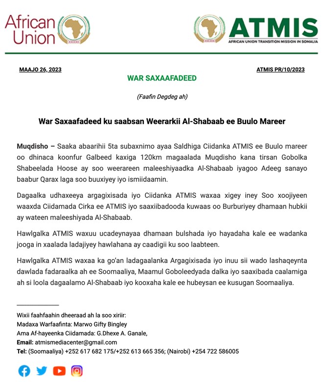 Jimco, May 26, 2023 (HOL) - Taliska ciidanka midowga Afrika ee ATMIS ayaa war saxaafadeed kasoo saaray weerarkii Alshabaab ay saakay waaberigii ku qaadeen saldhiggooda ku yaallay Buulo Mareer oo 120-km Koonfur-galbeed ka xigta Muqdisho.