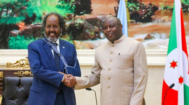 "Madaxweyne Xasan Xasan Sheekh ayaa kala hadlaya dhiggiisa dalka Burundi Mudane Évariste Ndayishimiye oo ah guddoomiyaha dalladda Bulshada Bariga Afrika (EAC) sidii loo dadajin lahaa dhameystirka galka Jamhuuriyadda Federaalka Soomaaliya ee ku aaddan ku biirista dalladdan oo fursad u noqonaysa ganacsiga iyo isu-socodka dadka Soomaaliyeed" ayaa lagu yiri war kasoo baxay Madaxtooyada Soomaaliya.
