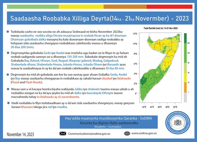 Khamiis, November, 16, 2023 (HOL) - Hay’adda ka hortagga masiibooyinka qaranka ee SOMDA ayaa qeylo dhaan xooggan ka soo saartay khatarta roobabka mahiigaanka ah ee lagu wado in ay ka da’aan gobollada dalka toddobaadka soo socda, sida ay muujinayso saadaasha hawada ee ugu dambeysay.