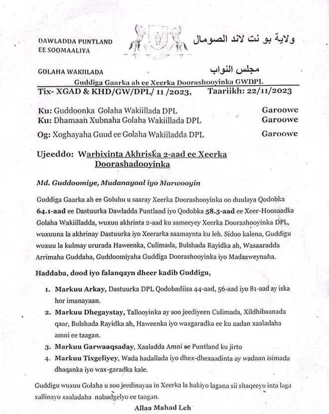 Khamiis, November, 23, 2023 (HOL) - Baarlamaanka Puntland ayaa isku khilaafsan meel marinta xeerka wax ka beddelka doorashooyinka Puntalnd, ee uu dhawaan baarlamaanka usoo gudbiyay guddiga doorashada ee PEC.