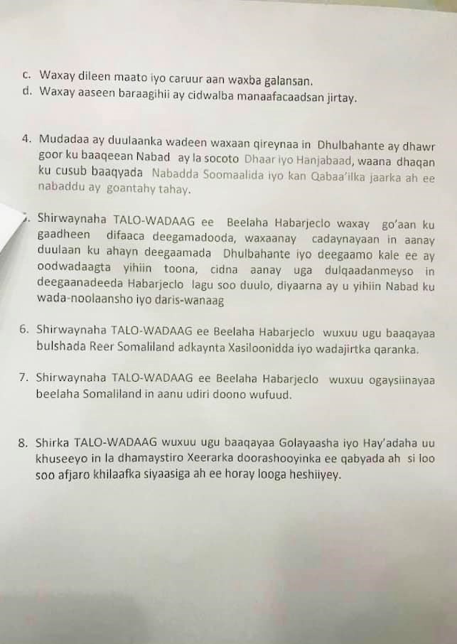 Talaado, November, 28, 2023 (HOL)- Shirwayne loogu magacdaray Talowadaag oo ay iskugu timid beelwaynta Bariga Burco, ayaa laga soo saaray baaq nabadeed iyo colaadeed oo ku wajahan colaadii baryahan ka taagnayd deegaanada Yayle iyo Buqdharkayn ee gobolka Sool.
