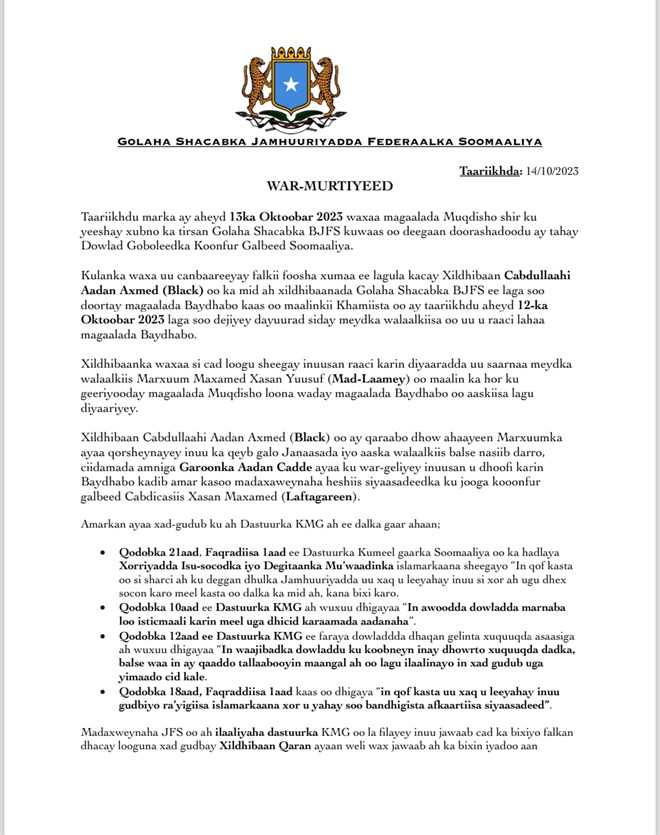 Sabti, October, 14, 2023 (HOL) - Qaar ka mid ah Xildhibaanada Golaha Shacabka Barlamaanka federaalka Soomaaliya ee deegaan doorashadoodu tahay Koonfur Galbeed ayaa baaq kasoo saarey xaalada siyaasadeed iyo amni ee maamulka Koonfur Galbeed.