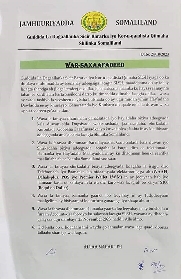 newsinsideGuddida ayaa fartay dhamaan shirkadaha ganacsiga iyo kuwa adeegyada bixiya in ay alaabada iyo adeegyada ay bulshada ka iibiyaan, ay ku iibiyaan Shillinka Somaliland.