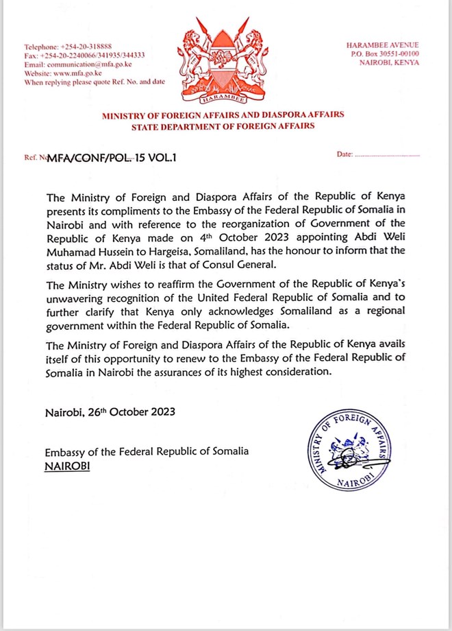 Khamiis, October, 26, 2023 (HOL) - Dowlada Kenya ayaa sheegtay in qunsulka ay dhawaan Somaliland u magacawday, uu yahay qunsul guud isla markaana, Kenya anay aqoonsanayn Somaliland.