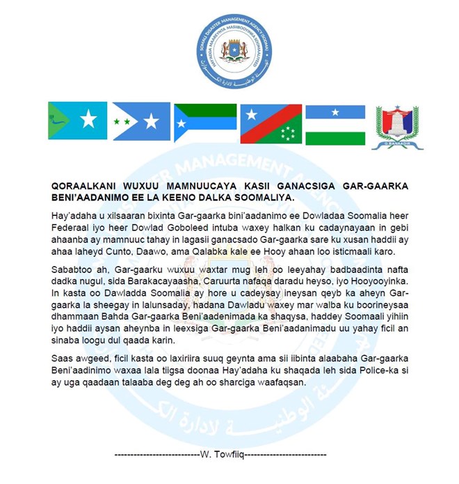 Khamiis, September, 21, 2023 (HOL) - Hay’adda maaraynta musibooyinka, iyo wasaaradaha u xilsaaran bixinta Gar-gaarka bini’aadanimo ee Dowladda Federaal iyo heer Dowlad Goboleed ayaa si wadajir ah u soo saaray qoraal mamnuucaya ka ganacsiga gargaarka la keeno Soomaaliya.