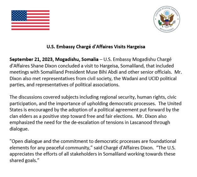 Khamiis, September, 21, 2023 (HOL) - Dowlada Maraykanka ayaa bogaadisay heshiiskii laga gaadhay khilaafkii doorashooyinka Somaliland, sidookale waxay ku baaqday in colaada Laascaanood wadahadal lagu dhameeyo.