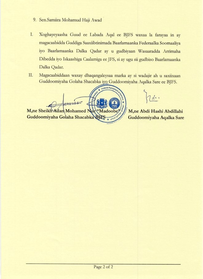 Guddoonka ayaa faray xoghayeyaasha guud ee labada Aqal in magacaabistan ay sida ugu dhaqsaha badan ugu gudbiyaan wasaaradda arrimaha dibedda iyo iskaashiga caalamiga ee dowladda Soomaaliya si ay ugu sii gudbiso Baarlamaanada dalalka Qatar iyo Kuwaut.