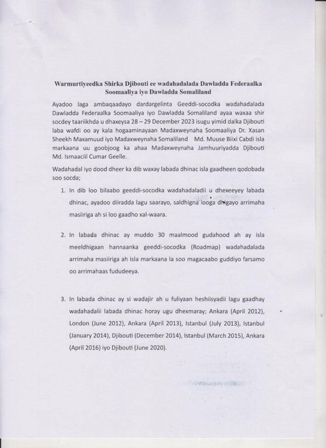 Jimco, December, 29, 2023 (HOL) - Waxaa goordhaw war murtiyeed laga soo saaray shir mudo laba maalmood uga socday dalka Jabuuti wafdi ay kala hoggaaminayeen madaxweynaha Soomaaliya Xasan Sheekh Maxamuud iyo madaxweynaha Somaliland Muuse Biixi Cabdi.