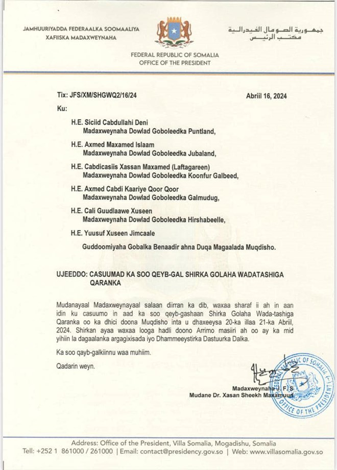 Arbaco, April, 17, 2024 (HOL) - Madaxweynaha dowladda federaalka Soomaaliya Xasan Sheikh Maxamuud ayaa madaxweynayaasha shanta dowlad goboleed iyo maamulka gobolka Banaadir ugu yeeray inay kasoo qeyb galaan shirka golaha wadatashiga.