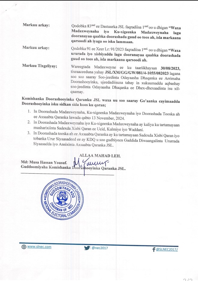 Sabti, April, 20, 2024 (HOL) - Guddida Doorashooyinka Somaliland ayaa ku dhawaaqday in doorashooyinka isa saaran ee madaxtooyada iyo axsaabta siyaasadu ay qabsoomi doonaan 13, November, 2024.