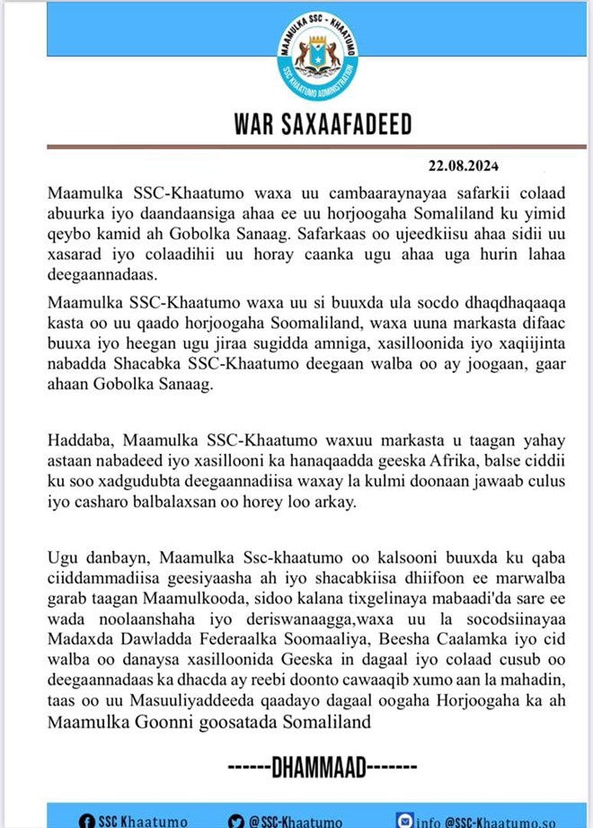 Maamulka SSC Khaatumo ayaa warsaxafeedka ku sheegay in dowladda Fedaraalka iyo Beesha Caalamka ay la socodsiinayaan daandaansiga iyo colaad hurinta madaxweynaha Somaliland, islamarkaana haduu dagaal cusub dhaco ay keeni doonto cawaaqib xumo aan la dhayelsan karin.
