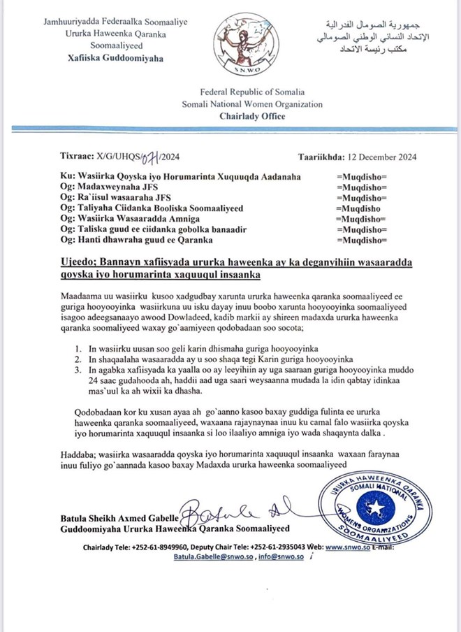 Jimco, December, 13, 2024 (HOL) - Guddoomiyaha Ururka Haweenka Qaranka Marwo Batuulo Sheikh Axmed Gabelle ayaa warqad ay shalay soo saartay ku faah faahisay go’aamadii ka soo baxay Guddiga Sare ee Haweenka Qaranka, waxaana ay shaaca ka qaaday in Wasiir Bashiir Goobe uu kusoo xad gudbay Guriga hooyooyinka uuna damacsan yahay inuu boobo.