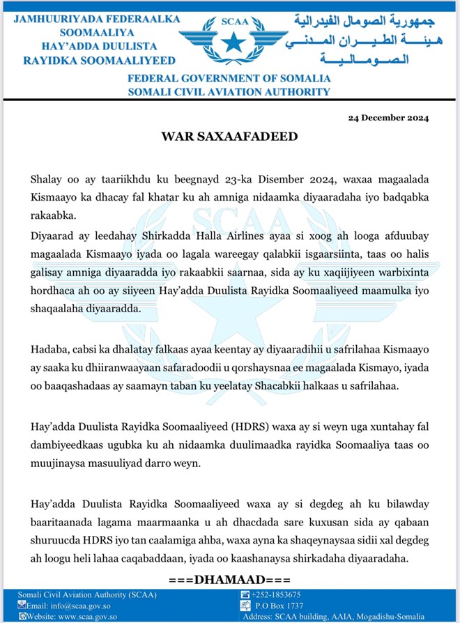 Talaado, December 24, 2024 (HOL) - Iyadoo maanta ay hakad ku jireen howlahii duulimaadyada diyaaradaha ee magaalooyinka Muqdisho iyo Kismaayo ayaa arintaasi waxaa goordhaw ka hadashay hay'adda Duulista Rayidka Soomaaliyeed oo ku eedeysay hakadka duulimaadyadaas maamulka Jubbaland.