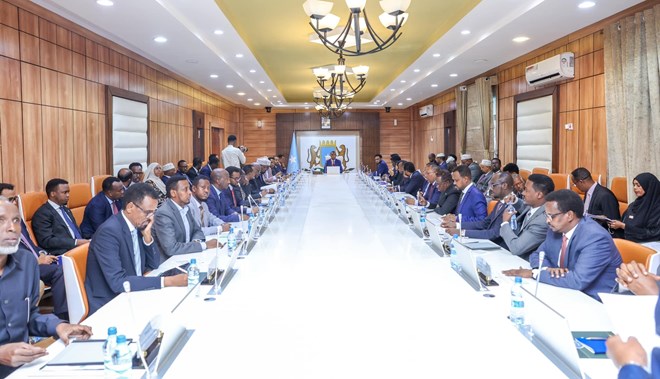 Khamiis, December, 5, 2024 (HOL) - Ra'iisul Wasaaraha Xukuumadda federaalka Soomaaliya Xamsa Cabdi Barre ayaa maanta oo Khamiis ah waxa uu shir Gudoomiyay Shirka Golaha Wasiirrada oo lagu soo bandhigay Warbixinno kala duwan oo la xiriira, amniga, qorshaha isbeddelka Qaranka iyo heerka ay mareyso canshuurta iibka oo tan iyo muddaddii la bilaabay sameeyey sare-ukac ballaaran.