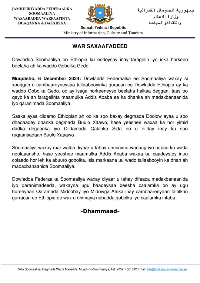 "Soomaaliya waxay mar walba diyaar u tahay derisnimo wanaag iyo nabad ku wada noolaaansho, hase yeeshee maamulka Addis Ababa waxaa uu caadeystey inuu colaado hor leh ka abuuro gobolka, isla markaana uu wado tallaabooyin ka dhan ah madaxbanaanida Soomaaliya" ayaa lagu yiri Warsaxaafadeed ka soo baxay wasaaradda warfaafinta Soomaaliya