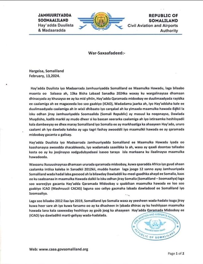 Talaado, February, 13, 2024 (HOL) - Somaliland ayaa sheegtay in dowlada Soomaaliya ay si qaldan uga faa'iidaysatay gacan ku haynta maamulka hawada.