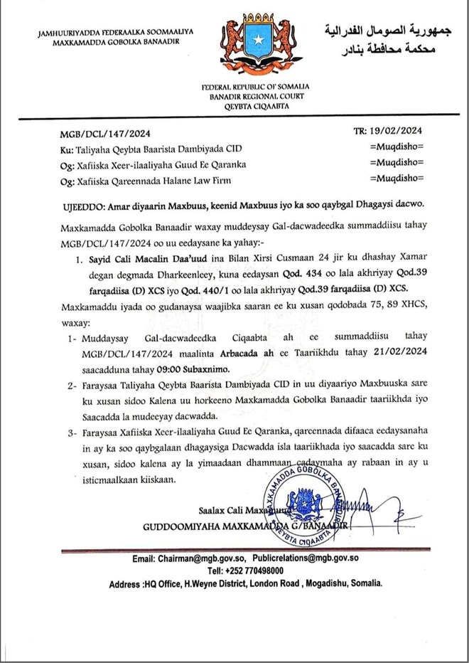 newsinsideWar qoraal ah oo kasoo baxay Maxkamadda gobolka Banaadir ayaa lagu faray Kaaliyaha qeybta dambi baarista CID-da in eedeysanaha uu horkeeno Maxkamadda 21-ka bishaan oo ku beegan maalinta Arbacada ah oo ay bilaabaneyso dhageysiga kiiska eedeysane sayid Cali Macalin Daa'uud.