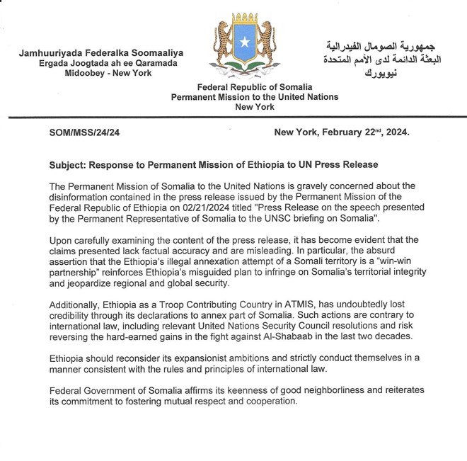 Sabti, February, 24, 2024 (HOL) - Howlgalka Soomaaliya ee Qaramada Midoobay ayaa walaac weyn ka muujiyay war-saxaafadeed kasoo baxay Ergayga Joogtada ah ee Ethiopia u fadhiya Qaramada Midoobay.