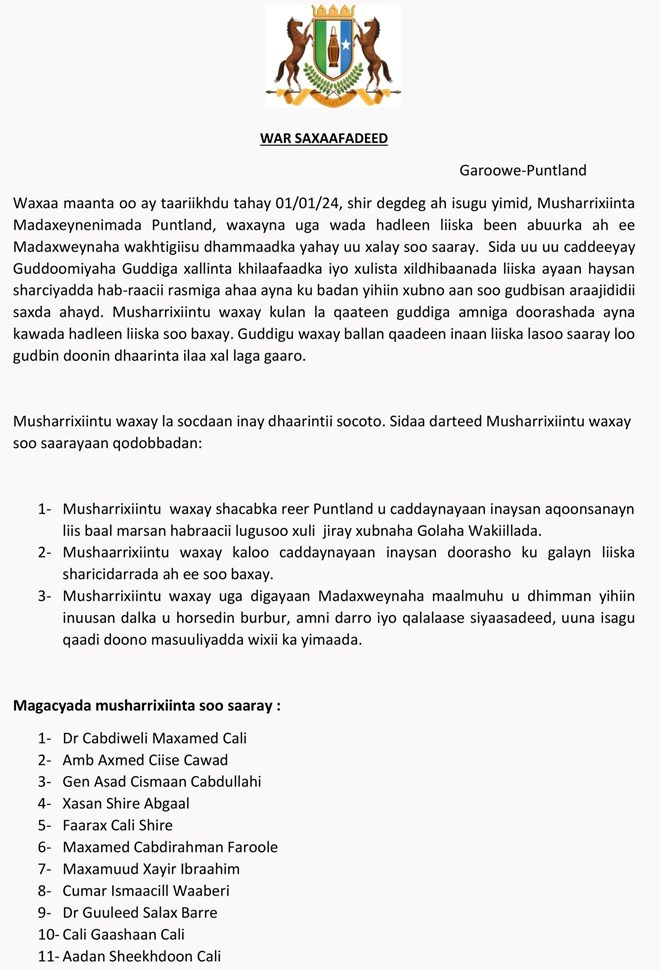 Isniin, January, 1, 2024 (HOL) - Musharaxiinta madaxweynaha Puntland ayaa si adag uga horyimid liiska xildhibaanada baarlamaanka oo ay soo gudbiyeen guddiga xallinta khilaafadka iyo ansixinta xubnaha baarlamaanka.