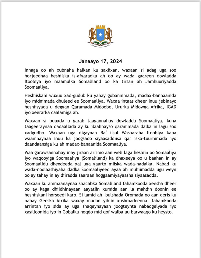 newsinsideBayaanka ay soo saareen ayaa waxay si adag uga soo horjeesteen heshiiskii is- afgaradka ahaa ee ay kala saxiixdeen Itoobiya iyo maamulka Somaliland ee ka tirsan dhulka Jamhuuriyadda Soomaaliya.