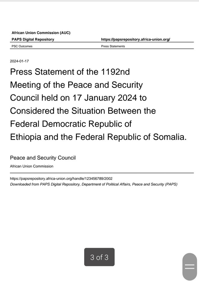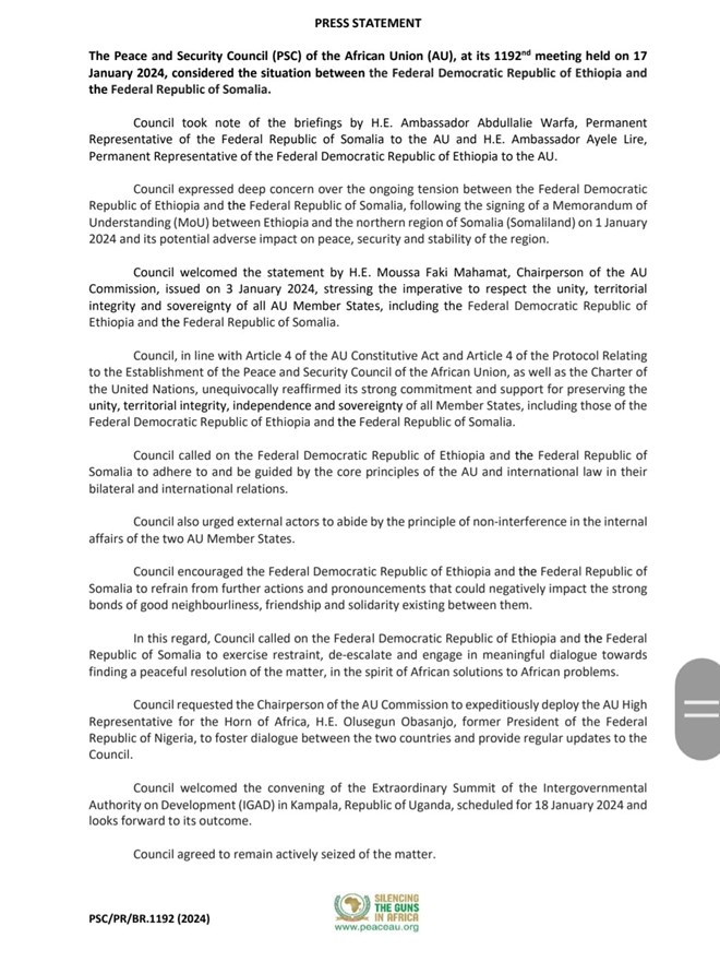 Arbaco, January, 17, 2024 (HOL) - Golaha Nabadda iyo Ammaanka ee Midowga Afrika, ayaa ugu baaqay dowladaha Itoobiya iyo Soomaaliya inay is-xakameeyaan, is-dejiyaan oo ay wada-hadal macno leh ka yeeshaan xiisadaha dhexdooda ka taagan.