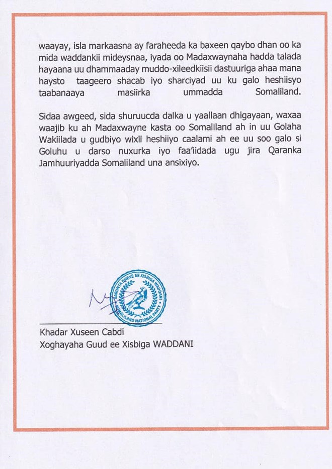 newsinside"Xisbiga Waddani waxa uu markasta ilaalinaya una taaganyahay madaxbannaanida Jamuuriyada Somaliland waxa uuna soo dhawaynayaa hadii uu jiro aqoonsiga Itoobiya iyo horumar kasta oo Somaliland danteeda ku salaysan" ayaa lagu yidhi qoraal kasoo baxay xisbiga.