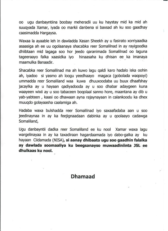 newsinsideWarsaxaafadeed kasoo baxday Wasaarada Warfaafinta Somaliland, oo lagaga jawaabay eedaynta dowlada Soomaaliya, ayaa lagu sheegay in sirdoonka dowlada federaalku uu maalmihii u danbeeyay beegsi ku hayay dadka kasoo jeeda Somaliland ee ku sugan magaalada Muqdisho, isla markaana qaar kood gacan ka hadal lagu weeraray.