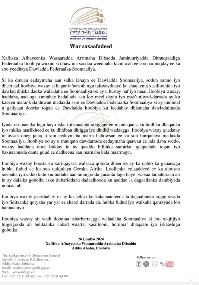 Warkaan kasoo baxay dowladda Itoobiya ayaa kusoo beegmaya, iyadoo xiriirka ka dhaxeeya Soomaaliya iyo Itoobiya uu aad u xumaaday wixii ka dambeeyay bishii janaayo ee sanadkaan 2024, kadib heshiiskii magaalada Addis Ababa ku dhexmaray raysal wasaaraha Itoobiya Aby Axmed iyo madaxweynaha maamulka Somaliland Muuse Biixi Cabdi, kaasoo ahaa in Itoobiya ay hesho qeyb ka mid ah biyaha iyo dhulka Soomaaliya, badalkeena Itoobiya dowlad u aqoonsaneyso Somaliland.
