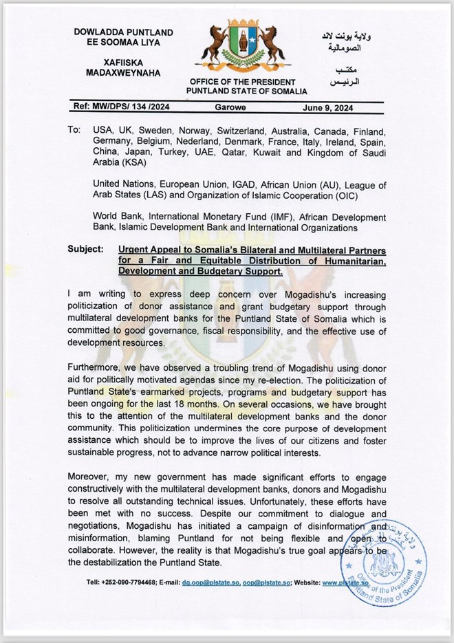 Isniin, Juun, 10, 2024 (HOL) - Puntland ayaa codsi degdeg ah u dirtay Saaxiibada caalamiga ah ee taageera Soomaaliya, iyagoo u gudbisay codsi ku aaddan in si caddaalad ah loo qaybiyo taageerada bani'aadantinimo, midda Horumarinta iyo taageerada Miisaaniyadda Soomaaliya.