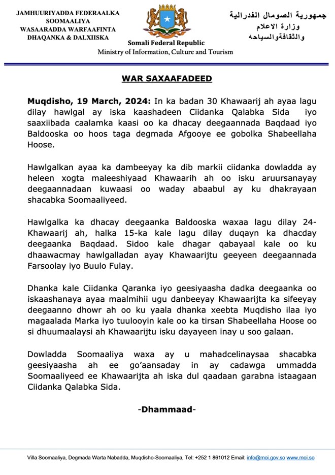 Talaado, Maarso, 19, 2024 (HOL) - Sida ay sheegtay dowladda Soomaaliya, in ka badan 30 dagaalame oo katirsan Shabaab ah ayaa lagu dilay hawlgal ay iska kaashadeen Ciidamada dowladda iyo saaxiibada caalamka, kaasi oo ka dhacay Baqdaad iyo Baldooska oo hoos taga degmada Afgooye ee gobolka Shabeellaha Hoose.