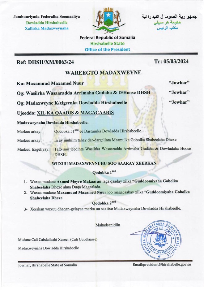 Talaado, Maarso, 5, 2024 (HOL) - Madaxweynaha maamulka Hirshabeelle Cali Cabdullaahi Xuseen Guudlaawe ayaa maanta xil ka qaadis ku sameeyay guddoomiyahii gobolka Shabeellaha Dhexe Axmed Meyre Makaraan oo loo yaqaano Axmed Faal.