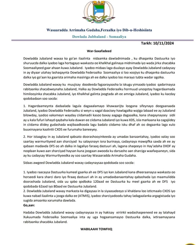 Axad, November, 10, 2024 (HOL) - Wasaaradda Arrimaha Gudaha ee Dowlad Goboleedka Jubaland ayaa soo saartay war saxaafadeed ay kaga hadashay arrimaha ka dhex aloosan Jubaland iyo Dowladda Federaalka waxeyna ay si toos ah ugu dhawaaqday inay hakisay xiriirkeedi wada shaqeyneed ee kala dhaxeysay Dowladda federaalka Soomaaliya.