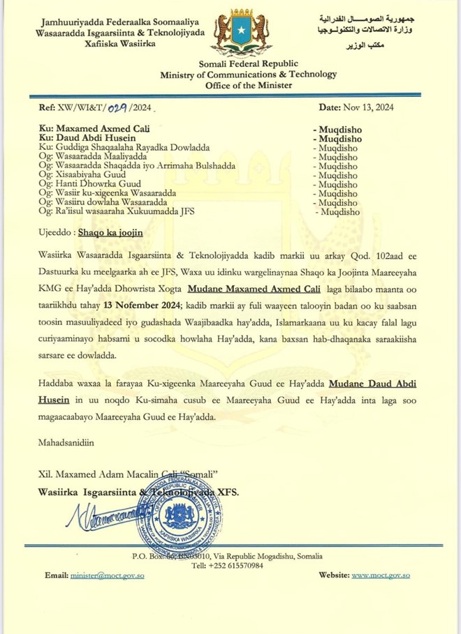 Arbaco, October, 13, 2024 (HOL) - Wareegto kasoo baxay Xafiiska Wasiirka Wasaaradda Isgaarsiinta iyo Tiknoolajiyada Xukuumaada Fedaraalka Soomaaliya Maxamed Aadan Macalin ayaa shaqada looga joojiyay maareeyahii ku meel gaarka ahaa ee hay'adda dhowrista Xogta Maxamed Axmed Cali Royal.