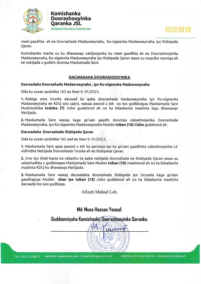 Khamiis, October, 14, 2024 (HOL) - Koomiishanka Doorashooyinka Somaliland, ayaa sheegay in marka hore lasoo saari doono natiijooyinka degmooyinka iyo gobolada, kadibna lagu dhawaaqi natiijada guud.