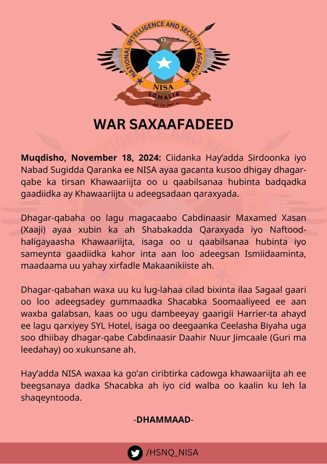 Isniin, October, 18, 2024 (HOL) - Warsaxafadeed kasoo baxay hay'adda Nabadsugida iyo Sirdoonka Qaranka Soomaaliyeed ee NISA ayaa lagu sheegay in ciidankeeda ay gacanta kusoo dhigeen Sarkaal kooxda Al-shabaab u qaabilsanaa hubinta iyo sameynta baaburta ay u adeegsadaan qaraxyada.