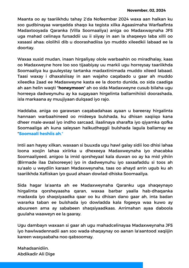 newsinside“Maanta oo ay taariikhdu tahay 2’da Nofeembar 2024 waxa aan halkan ku soo gudbinayaa warqadda shaqo ka tegista xilka Agaasimaha Warfaafinta Madaxtooyada Qaranka (Villa Soomaaliya) aniga oo Madaxwaynaha JFS uga mahad celinaya fursaddii uu ii siiyay in aan la shaqeeyo laba xilli oo xasaasi ahaa” ayuu ku yiri warqadda is casilaadda Cabdulqaadir Cali Dige.