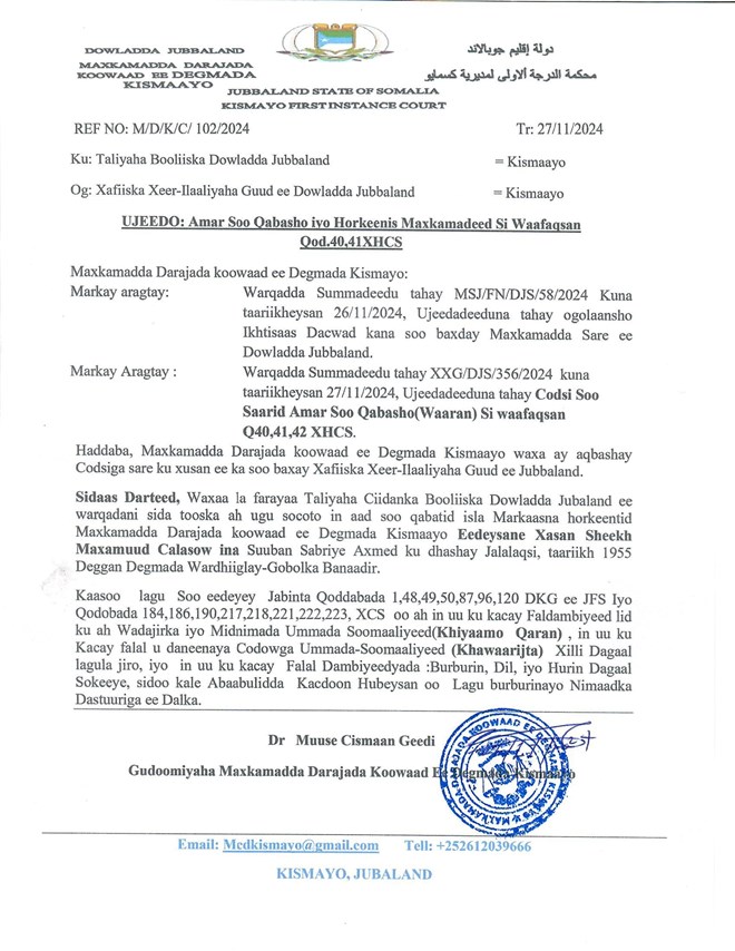 Guddoomiyaha Maxkamadda Kismaayo, Dr. Muuse Cismaan Geeddi, ayaa amar ku bixiyay in ciidamada Booliska Jubbaland ay si degdeg ah u soo qabtaan madaxweynaha Soomaaliya, kadibna la horgeeyo maxkamadda darajada koowaad ee Kismaayo, si loogu qaado dacwad sharci ah.
